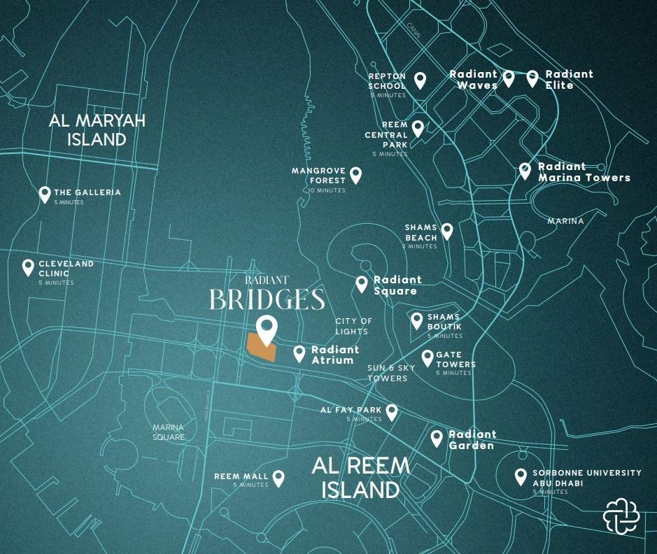 Located on Al Reem Street in the City of Lights district, Radiant Bridges Towers enjoys exceptional connectivity to Abu Dhabi’s major business and lifestyle destinations. The development offers quick access to: Reem Mall, Al Maryah Island, Galleria Mall, Reem Central Park, and Downtown Abu Dhabi. With its strategic location between the city and the waterfront, the project offers the perfect blend of urban convenience and island tranquility — making it a high‑value choice for buyers and investors.